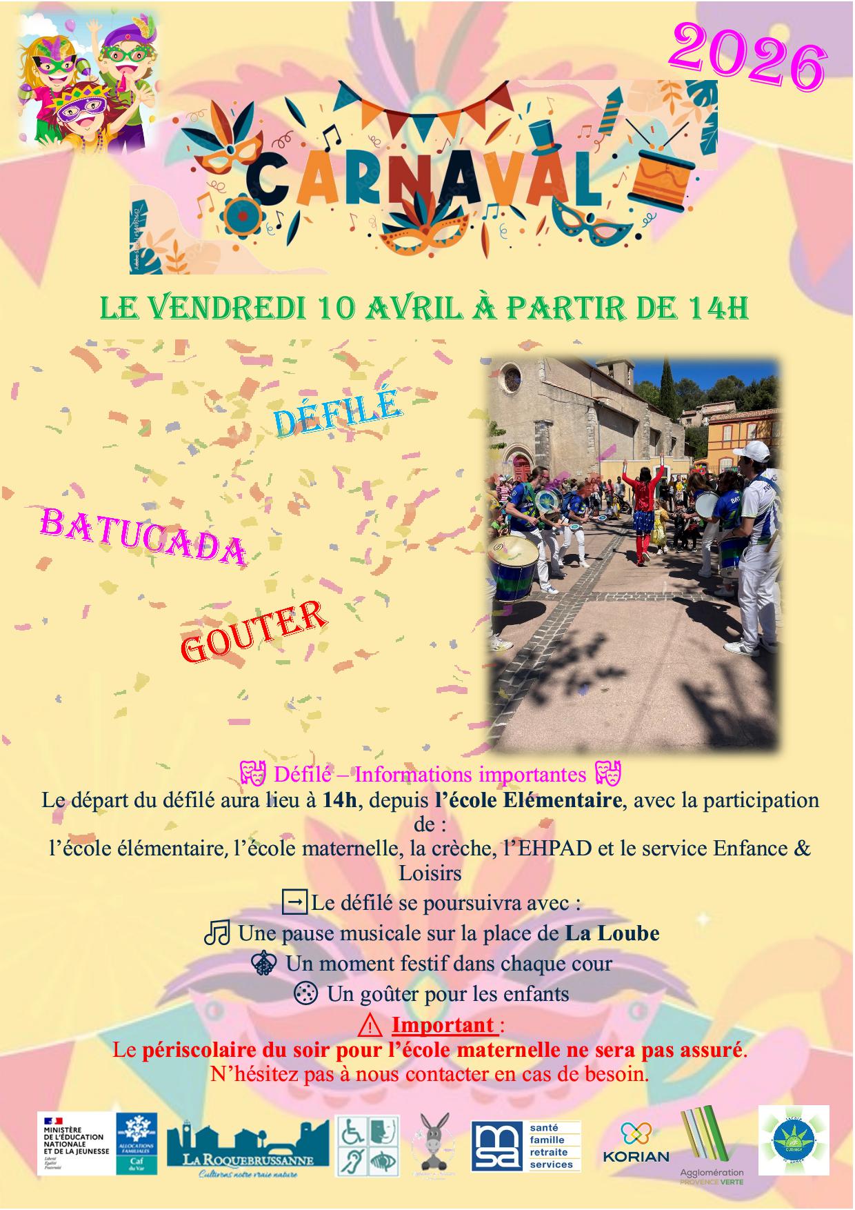 Le carnaval des écoles se déroulera le vendredi 10 avril de 14h à 16h30. Départ depuis l'école élémentaire
